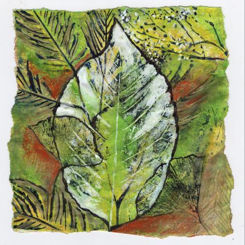 I have expanded my use of mixed technique, besides using collography, drawing, painting, inking I also use monoprinting and the best of all just plain old leaf printing which I loved as a child. And that is how I feel, like a child exploring playing with matter. I let the leaves guide me and the outcome always astounds me.