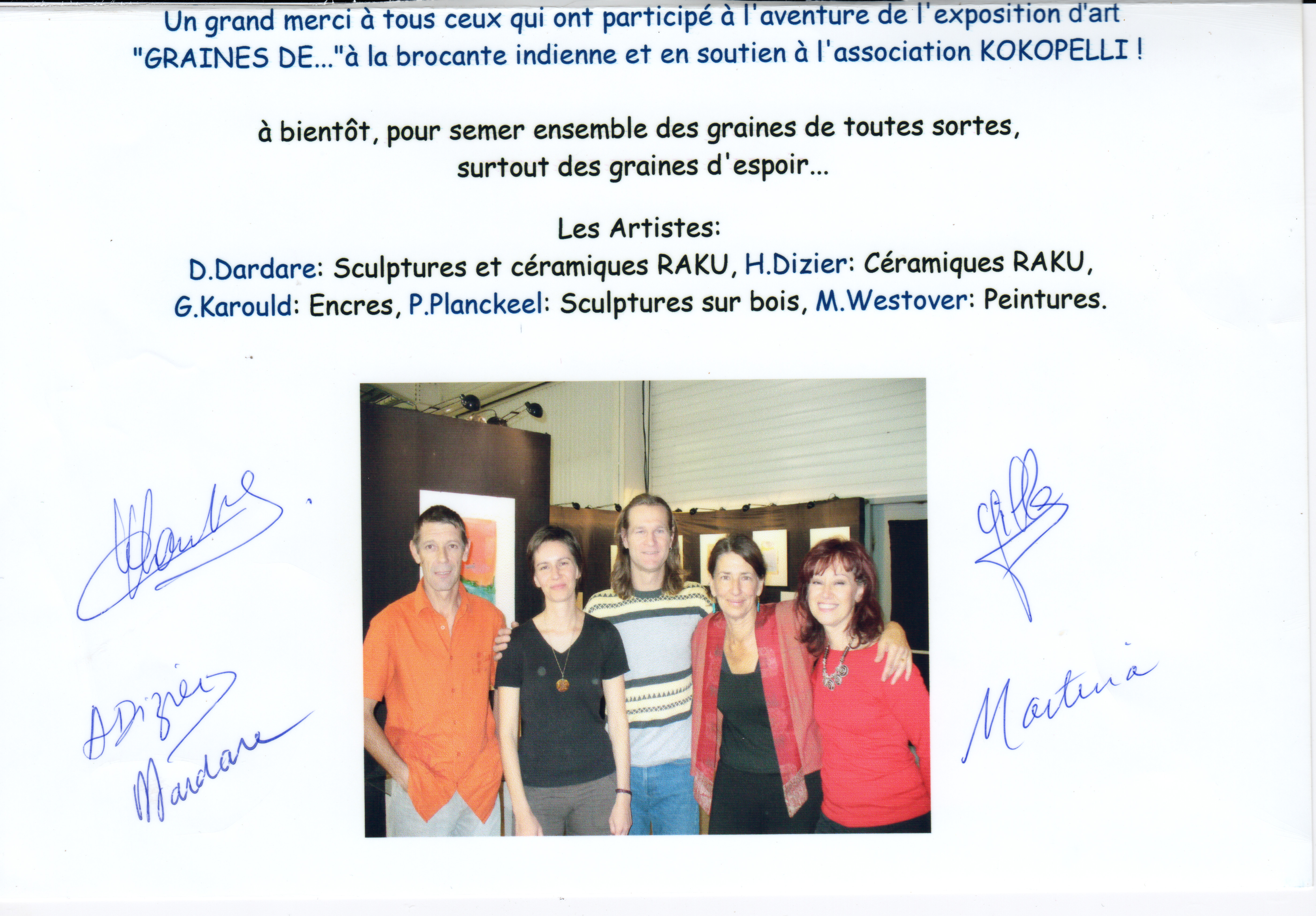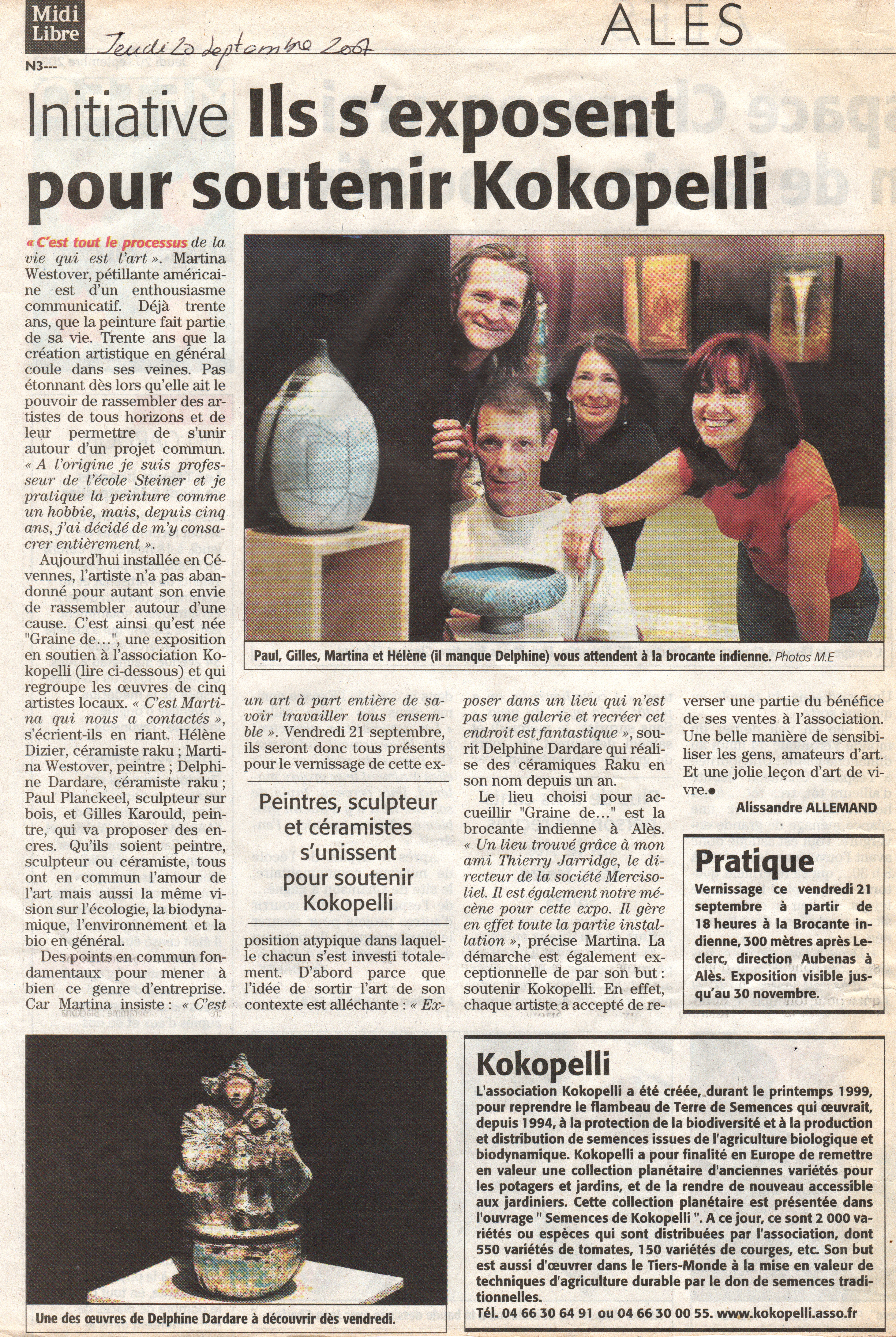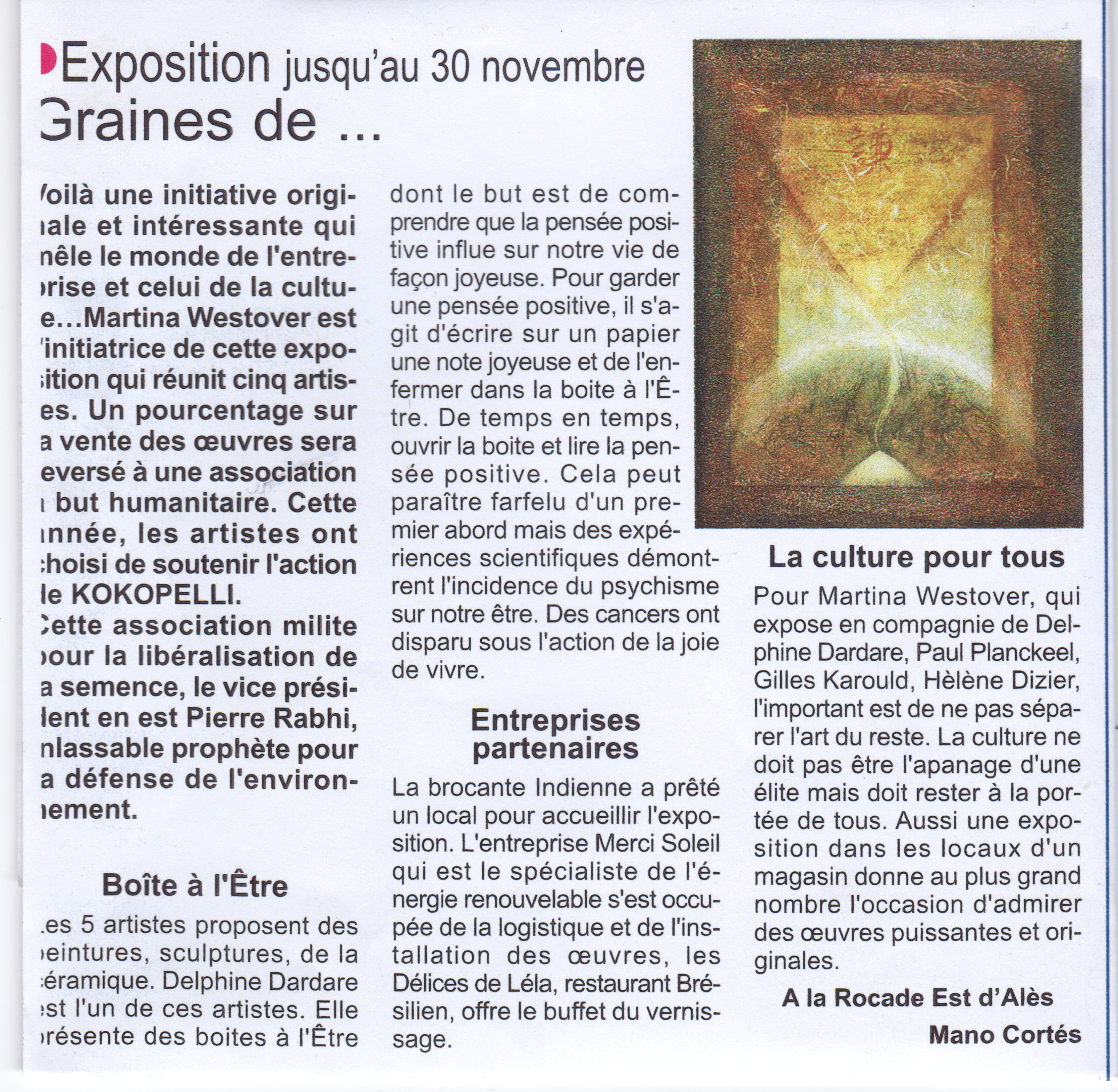Cette exposition d'art, est l'occasion pour cinq artistes de se réunir autour d'un même désir : Présenter leurs créations avec joie et passion, soutenir l'action de l'association Kokopelli, association qui oeuvre pour la protection de la biodiversité alimentaire, la promotion de la pratique agro-écologique et au recouvrement par les jardiniers et paysans du droit à produire leurs propres semencGraines dees. Par solidarité les artistes feront un don sur le vente de leurs oeuvres à l'association. Grand merci à Thierry Jarrige de la SCOP Merci Soleil pour son son soutien. Nous vous invitons chaleureusement à cette exposition qui a lieu du 21 septembre au 30 novembre pour venir rencontrer les artistes, l'association Kokopelli et semer ensemble des graines de toutes sortes, surtout des graines d'espoir...