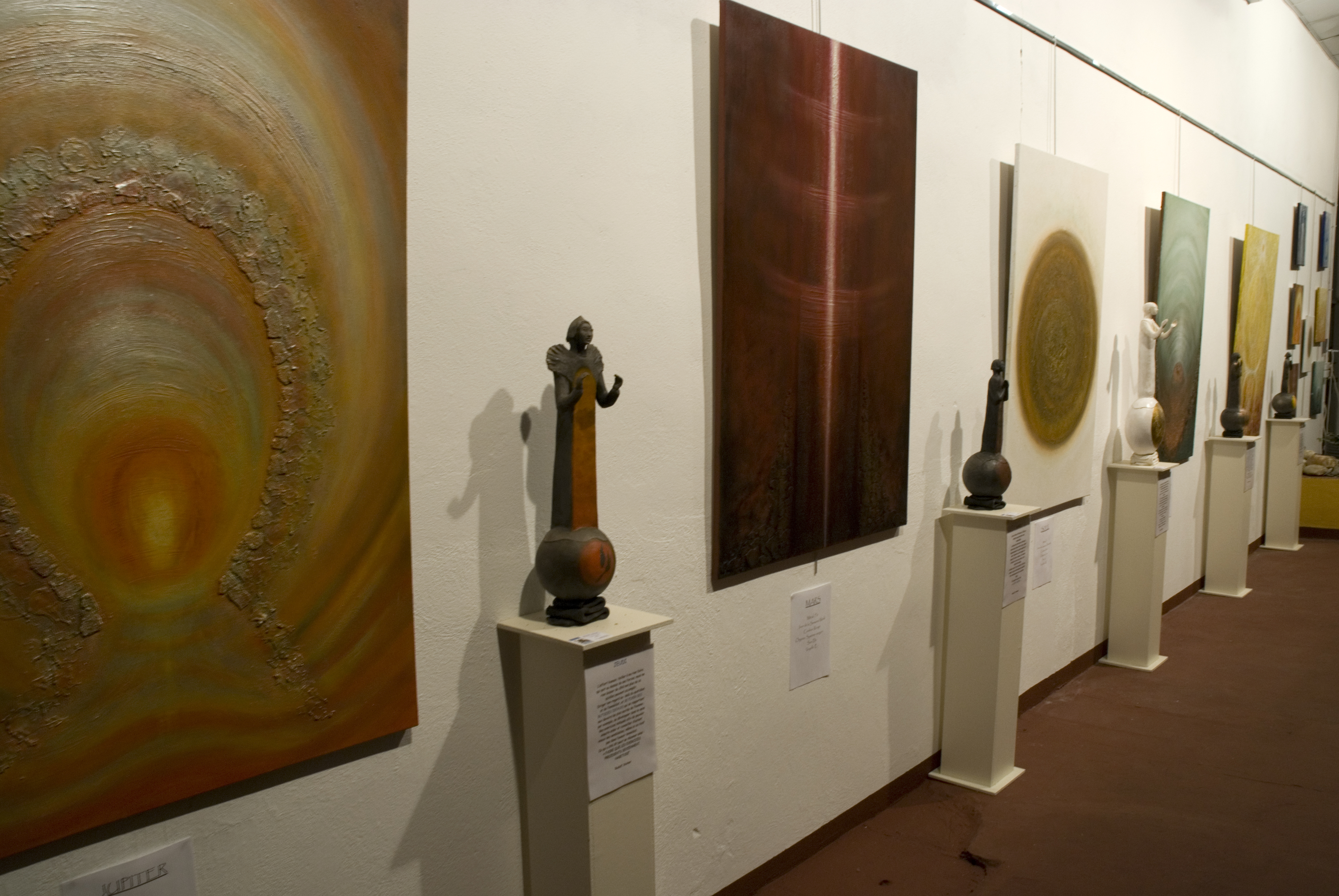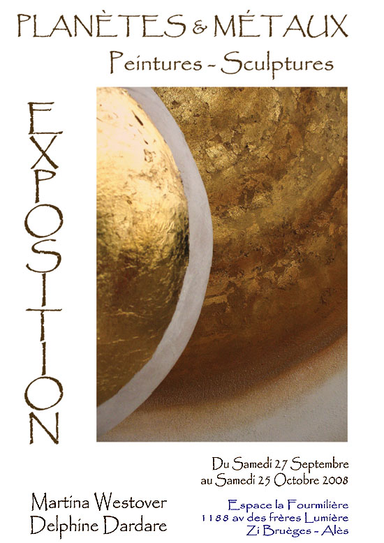 Martina Westover et Delphine Dardare exposent à la Fourmiliere jusqu'a fin Octobre. Elles ont uni leurs oeuvres autour du thème des planètes et des métaux. La première s"exprime en peinture, la seconde s'inspirent des toiles pour façonner enter ses mains des personnages planètes. Le résultat forme une belle exposition oû chaque toile grande format voisine sa statue. L'exposition soutien l'association Collectif Créatif Cévenol qui oeuvre pour un éveil écologique urbain.