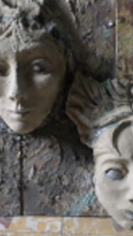 Papier mâché  (papier kraft recyclé et  colle à papier pour murs ) moulé sur des sculptures en terre faites main. Puis peint et décoré avec du métal, fil de fer, plumes rubans, objets naturels et plus...Vernis à la fin.